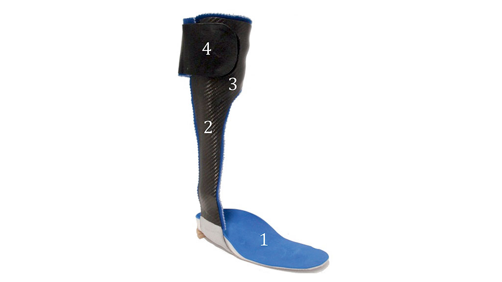 Mithilfe der Testorthesen wurden im Anschluss die definitiven Gipsmodelle hergestellt, die mit Kork als Distanzmaterial für das spätere Innenpolster versehen wurden. Nach der Festlegung des Orthesenrandverlaufs, der Abrollkante, der Verschlussart und ‑richtung sowie der Elastizitätseigenschaften von Orthesenvor- und rückfuß wurden die Orthesen in der Ottobock-Servicefertigung hergestellt. Die letzten Arbeitsschritte bestanden aus der Montage der individuell hergestellten Fußbettung, dem Auskleiden der Orthese mit Frottee, dem Polstern der Tibia-Anlage mit Gelmaterial und der Anbringung der Verschlusstechnik. In Abbildung 4 ist exemplarisch eine fertig gestellte individuelle dGRAFO dargestellt.