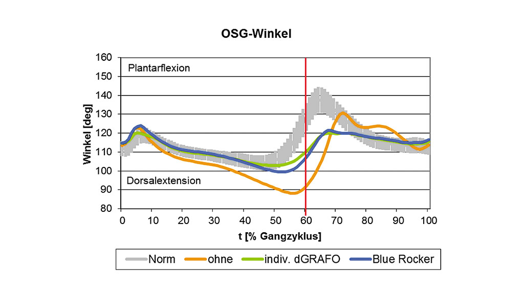 In Abbildung 7 sind die Mittelwertkurven des OSG-Winkels in den drei untersuchten Situationen im Vergleich zur Normalkurve dargestellt. Grundsätzlich konnte in der Situation ohne Orthese von Beginn der mittleren Standphase bis zu Beginn der mittleren Schwungphase ein kleinerer Winkel (verstärkte Dorsalextension) im Vergleich zur Normal-Gruppe gemessen werden. Mit beiden Orthesen ließ sich diese abnorme Bewegung reduzieren. Während sich die individuelle dGRAFO insgesamt dem normalen Bewegungsablauf deutlicher näherte, ließ die Blue Rocker-Orthese einen etwas größeren Bewegungsumfang zu.