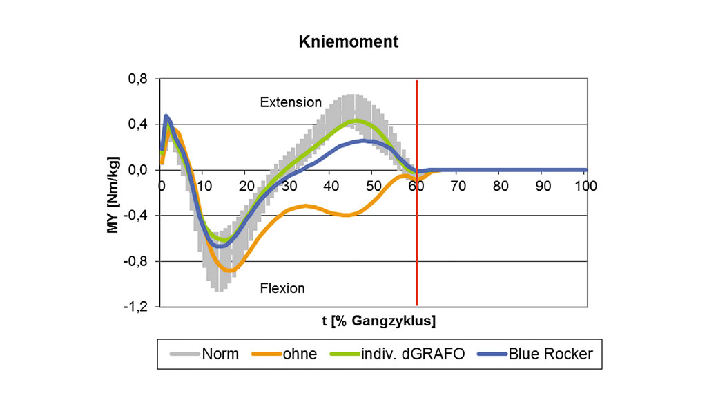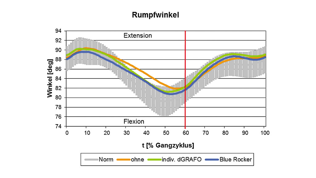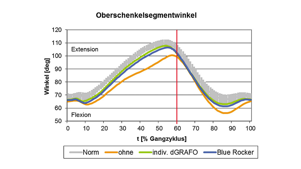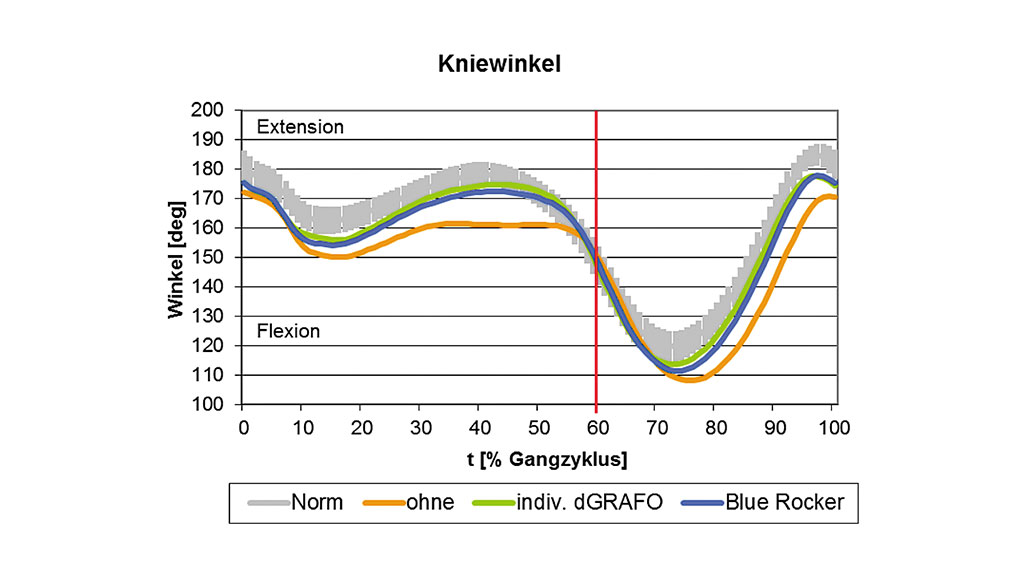 Am Verlauf des Kniewinkels (Abb. 8) konnte in der Situation ohne Orthese eine unphysiologische Knieflexion vom Beginn der mittleren Standphase bis zum Ende der Vorschwungphase festgestellt werden. Beide Orthesen wirkten hier in Richtung der physiologischen Knieextension. Das Extensionsmaximum vergrößerte sich um 2° mit der individuellen dGRAFO gegenüber der Blue Rocker-Orthese. Zu Beginn der mittleren Schwungphase war ohne Orthese im Vergleich zum Normalverlauf ebenfalls eine übermäßige Knieflexion zu erkennen. Mit beiden Orthesen konnte hier eine deutliche Reduktion dieser Auffälligkeit erreicht werden. Die individuelle dGRAFO näherte sich hier ebenfalls um 2° dem Normal-Bewegungsumfang gegenüber der Blue Rocker-Orthese.