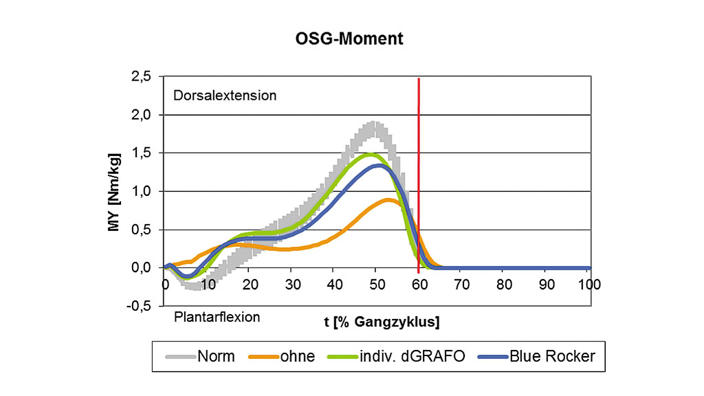 Durch die Schwäche der Dorsalextensoren bedingt, konnte während der Gewichtsübernahme am OSG-Moment in der Situation ohne Orthese kein plantarflektierendes Moment gemessen werden. Mit beiden Orthesen war es hingegen möglich, die passive Plantarflexion zu kontrollieren.