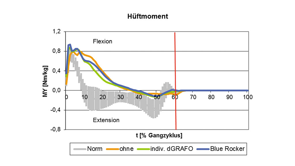 In den Ergebnissen des Hüftmomentes war in allen drei untersuchten Situationen in der mittleren Standphase ein stark flektierend wirkendes Moment auffällig. Tendenziell zeigen die Kurven beider Orthesen-Typen eine geringe Annäherung an das Extensionsmoment, das im physiologischen Fall wirkt (Abb. 13). Das Moment der individuellen dGRAFO beträgt bei 20 % Gangzyklus 0,23 Nm/kg und das der Blue Rocker 0,35 Nm/kg.