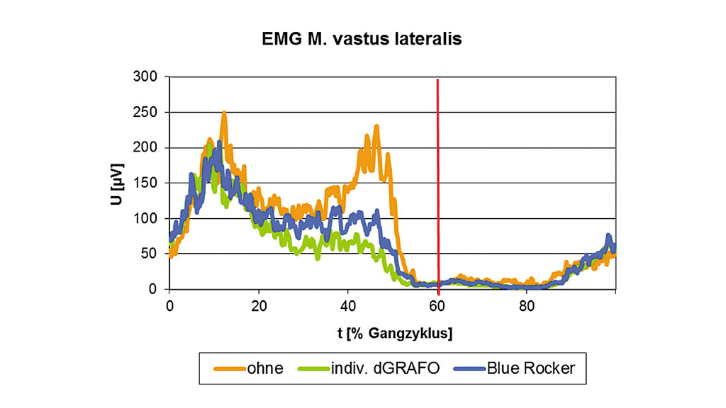Wie in Abbildung 14 dargestellt, zeigte der M. vastus lateralis in der Situation ohne Orthese eine unphysiologische Aktivität von der terminalen Standphase bis zum Anfang der Vorschwungphase. Mit beiden Orthesen-Typen war eine Reduktion dieser Aktivität messbar. Mit der individuellen dGRAFO zeigte sich dieser Effekt am deutlichsten.