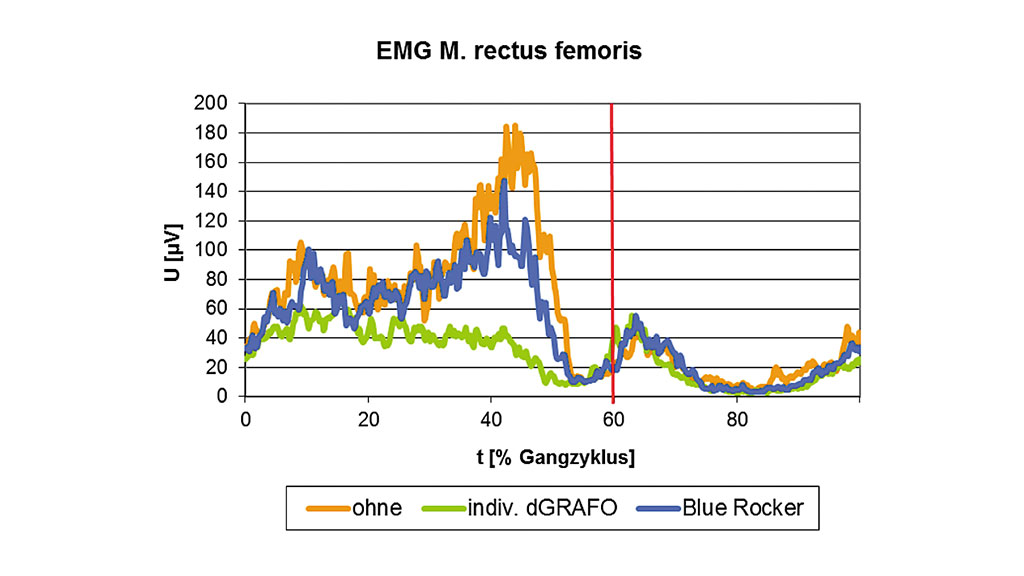 Ohne Orthese konnte eine unnatürliche hohe Aktivität des M. rectus femoris von Beginn der mittleren Standphase bis zu Beginn der Vorschwungphase beobachtet werden. Auch hier konnte mit beiden Orthesen-Typen diese Aktivität verringert werden. Der Unterschied der beiden Orthesen-Typen ist hier sehr groß. Das EMG zeigt eine deutlich geringere Muskelaktivität der individuellen dGRAFO im Vergleich zur Blue Rocker-Orthese (Abb. 15).