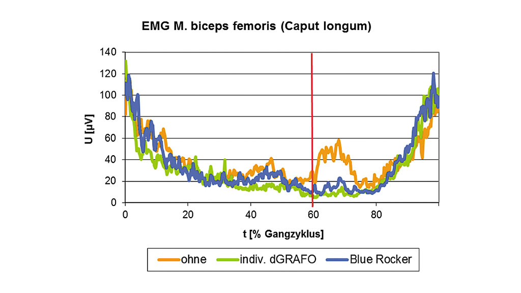 Beim Gehen ohne Orthese konnte in zwei Phasen des Gangzyklus eine unphysiologische Muskelaktivität des M. biceps femoris (Caput longum) festgestellt werden: zum einen in der terminalen Standphase und zum anderen in der initialen Schwungphase. Mit beiden Orthesen-Typen konnte diese Muskeltätigkeit reduziert werden (Abb. 16).
