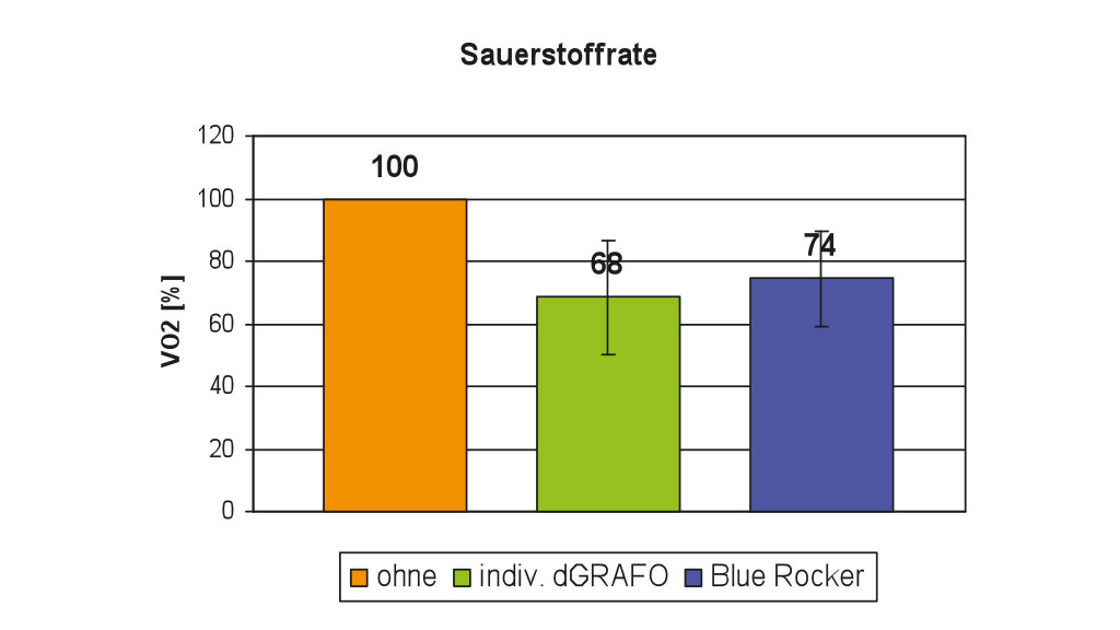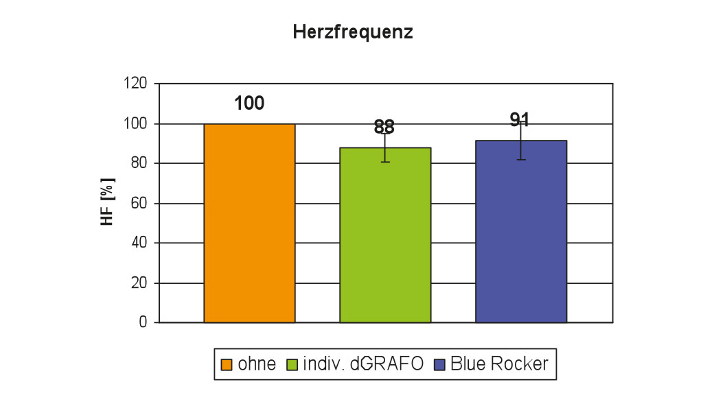 Die Sauerstoffrate reduzierte sich im Mittel mit beiden Orthesen-Typen. Die Daten des metabolischen Energieverbrauchs korrelierten mit den Messergebnissen der Herzfrequenz. Die Herzfrequenz sank ebenfalls in den Messungen mit beiden Orthesen-Typen. Prozentual dargestellt bedeutet das für die Situation mit der individuellen dGRAFO eine verringerte Sauerstoffrate gegenüber der Messung ohne Orthese um 32 % bei einer Herzfrequenzreduktion von 12 %. Mit der Blue Rocker-Orthese verringerte sich die Sauerstoffrate um 26 % bei einer geringeren Herzfrequenz von 9 % (Abb. 17 u. 18).