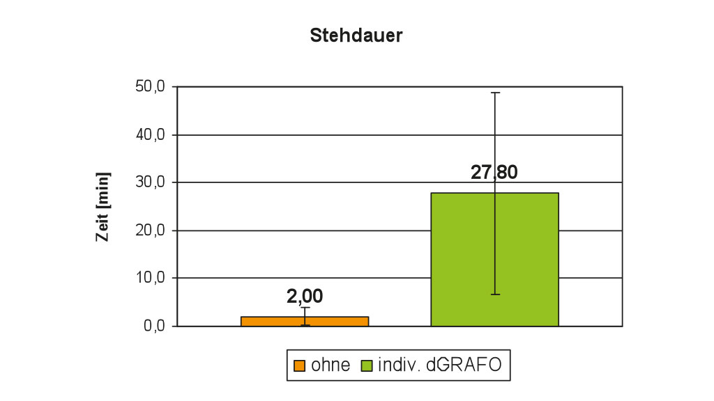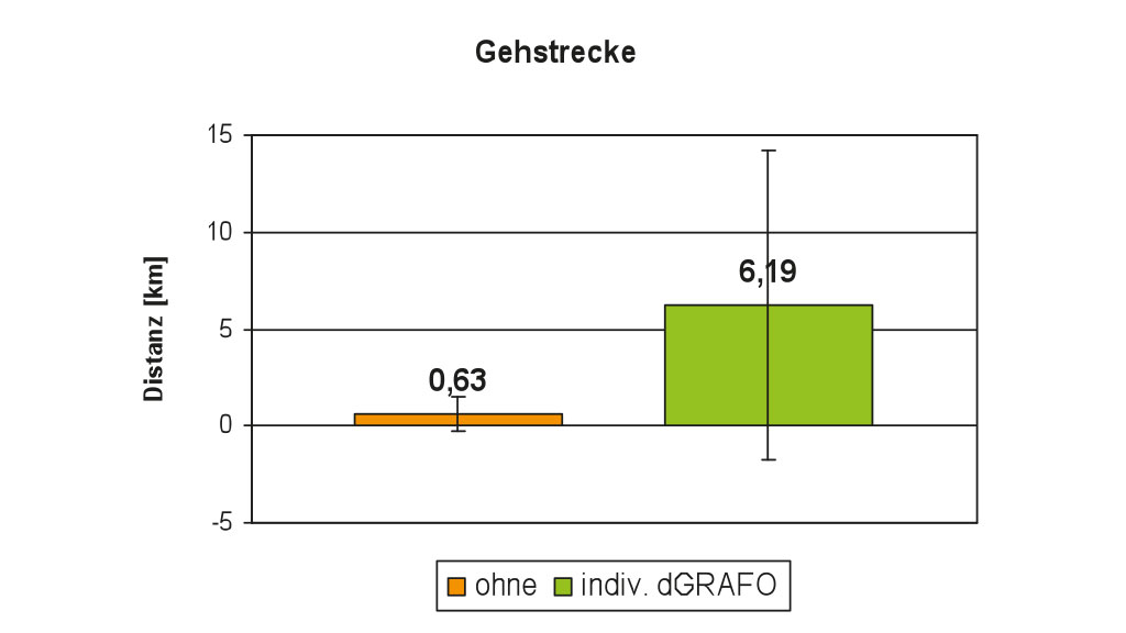 Wie in der Tabelle 5 zu sehen ist, haben sich die Schmerzen mit Nutzung der Orthesen bis auf ein Minimum reduziert oder verschwanden ganz. Die maximale Stehdauer hatte sich im Gruppenmittel deutlich von 2 min in der Situation ohne Orthese auf 27,8 min mit der individuellen dynamischen GRAFO erhöht (Abb. 19). Die maximal zu bewältigende Gehstrecke hatte sich im Mittel deutlich verlängert. Es konnte eine nahezu Verzehnfachung der möglichen Gehstrecke von 0,63 km ohne Orthese auf 6,19 km mit der individuellen dynamischen GRAFO festgestellt werden (Abb. 20).