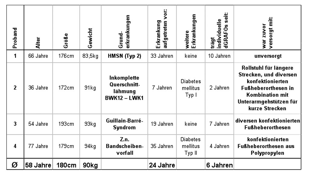 Das Patientenkollektiv setzte sich aus vier Männern zusammen. Die relevanten Einzeldaten sind in der Tabelle 1 aufgeführt. Die primäre pathologische Gemeinsamkeit bestand in der Insuffizienz der Unterschenkelmuskulatur. Das Muskelkraftniveau der fußhebenden und ‑senkenden Muskulatur lag, bis auf eine Ausnahme, unterhalb von Stufe 3, gemäß der Muskelfunktionsuntersuchung nach Janda [10]. Die Fußheber des linken Beins von Proband 2 hatten einen Muskelstatus von Stufe 3.