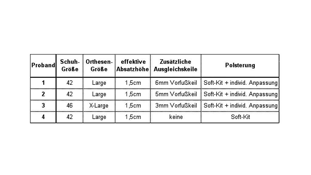 Für den Komfort sorgte die Auskleidung des dazugehörigen Soft-Kits [vergleiche auch 3]. Ausgehend von der effektiven Absatzhöhe von 1,5 cm wurde die Statik mit Ausgleichskeilen soweit wie möglich optimiert [vergleiche auch 2] (siehe Tab. 3). Die Entscheidungsparameter hierfür waren, wie oben erwähnt, die Messdaten der Statikanalyse mit dem L.A.S.A.R. Posture.