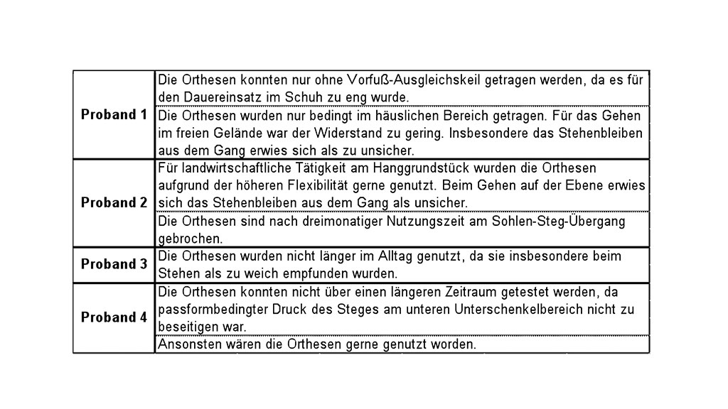 Die Aussagen der Patienten zu den Alltagserfahrungen mit der Blue Rocker-Orthese sind in der Tabelle 4 aufgeführt. Faktisch konnten aus unterschiedlichen Gründen nur von einem Patienten die Blue Rocker-Orthesen genutzt werden, allerdings nur zu landwirtschaftlichen Arbeiten am Hanggrundstück. Hier stellte die höhere Flexibilität einen Vorteil dar. Dieser hohen Belastung hielten die Orthesen jedoch nur knapp drei Monate stand. Folglich konnte die subjektive Einschätzung nur noch im Vergleich ohne Orthesen und mit der individuellen dGRAFO ausgewertet werden.