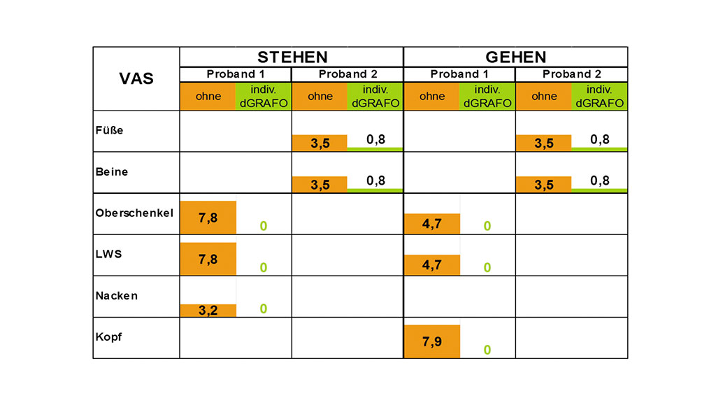 2. Mit einer individuellen dGRAFO, die nach der hier beschriebenen Methode hergestellt wurde, ist eine deutliche Verbesserung des Stehens und Gehens und somit eine physiologischere Belastung des Bewegungsapparates möglich. In dieser Untersuchung bestätigten dies die biomechanischen Resultate, die sich in den Alltagserfahrungen widerspiegelten. Mit diesem Orthesentyp ist eine Versorgung möglich, die den individuellen Anforderungen des Patienten am besten entspricht. Dies ist insbesondere für die gewünschte Nutzung über lange Zeiträume bedeutsam.