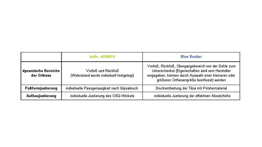 Es wurden jeweils individuelle dGRAFOs hergestellt (MALMÖ-Technik, Ottobock-Servicefertigung D) und vorkonfektionierte Blue Rocker-Orthesen (Allard International, c/o Camp Scandinavia AB, SE) angepasst, sodass für jeden Patienten das Gehen in der Ebene in drei Situationen analysiert werden konnte: ohne Orthesen, mit individuellen Orthesen und mit vorkonfektionierten Orthesen. Es fanden auf einer 12 m langen Gehstrecke, mit selbst gewählter Geschwindigkeit, randomisiert vergleichende instrumentelle Ganganalysen statt: