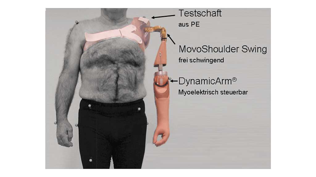 Für die Untersuchung wurde für jeden Probanden unter gleichen Bedingungen ein Testschaft erstellt. Die Prothese beinhaltete das Schultergelenk MovoShoulder Swing 15 16. Dieses Schultergelenk ermöglicht den Freischwung in der Sagittalebene. Über eine Schraube kann dieser Freischwung gebremst werden. Des Weiteren kann das Schultergelenk gedämpft in der Frontalebene schwingen. Als Ellbogengelenk wurde der DynamicArm® 17 gewählt. Durch die Funktion der bandagenlosen Steuerung ist ein solches Ellbogengelenk nach Herstellerangaben gerade für Menschen, die im Bereich des Schultergürtels amputiert oder exartikuliert sind, sehr gut geeignet.