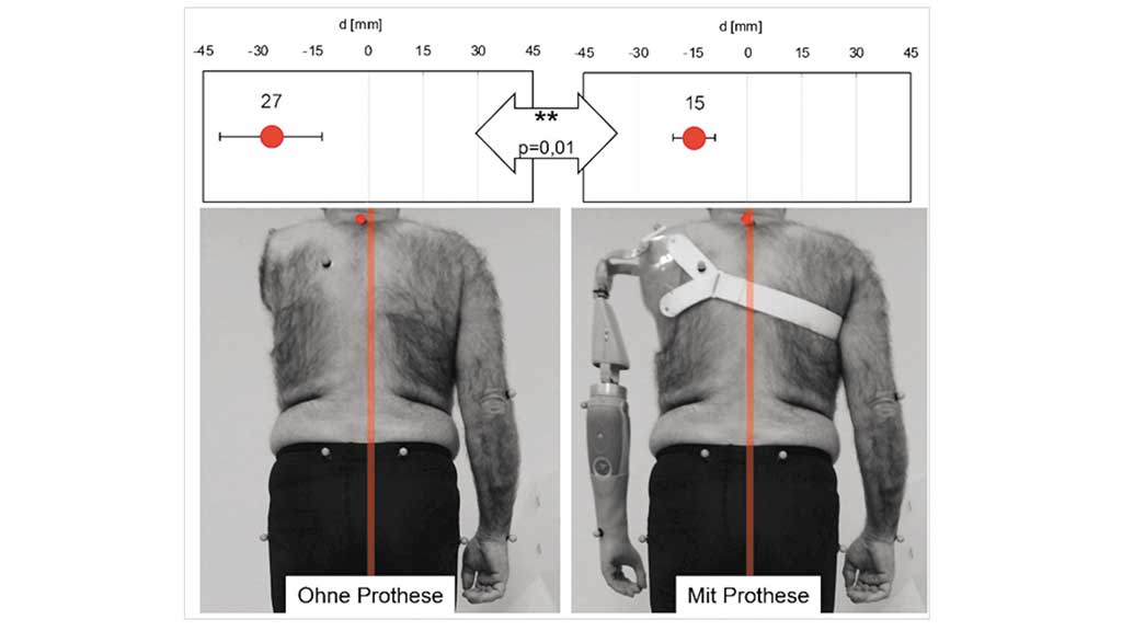 Einseitige Armamputationen verursachen unter anderem durch den Gewichtsverlust Asymmetrien der Körperhaltung 24 25. Dieser Gewichtsverlust liegt bei Schulterexartikulierten bei durchschnittlich ca. 4,2 kg 26. Durch ein handelsübliches Prothesensystem mit elektrisch betriebenen Ellbogen mit einem Gesamtgewicht von ca. 2,4 kg konnten in dieser Studie die Asymmetrie im Stand um durchschnittlich 45 % reduziert werden. Der Amputierte steht mit Prothese deutlich aufrechter mit einem sehr viel geringeren Rumpfüberhang zur nicht amputierten Seite.