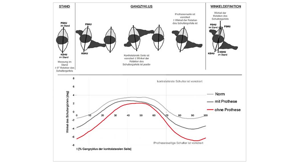 Ein weiteres Ergebnis, das auch mit den Beobachtungen von Greitemann 29 übereinstimmt, ist die Rumpfrotation während des Gehens. Durch die fehlende Extremität ergibt sich eine Torsion des Rumpfes mit Vorrotation der amputationsseitigen Schulter 30. Der Effekt ist maximal zum Zeitpunkt des Beginns der kontralateralen Standphase. Da sich Arme und Beine gegenläufig bewegen, sollte zu diesem Zeitpunkt des Beginns der kontralateralen Standphase der Prothesenarm im Schultergelenk maximal flektiert sein. Diese natürliche, gegenläufige Bewegung minimiert die Rotationsamplitude des Rumpfes, die aus der Bewegung der Beine resultiert 31.