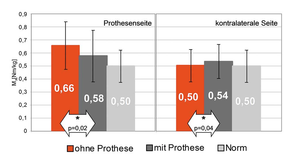 Hinsichtlich der Gelenkbelastung der unteren Extremität ist ein deutlicher positiver Effekt durch die Prothese am Kniegelenk zu messen. In der Frontalebene ist beim Gehen ein Varusmoment im Knie mit Maximalwerten von 0,55 bis 0,60 Nm/kg physiologisch. Liegt der Wert über einen längeren Zeitraum über dieser physiologischen Grenze, sind die Bedingungen zur Entstehung einer Arthrose im Knie begünstigt. Dies wird ausführlich in der Arbeit von Goh 34 beschrieben.