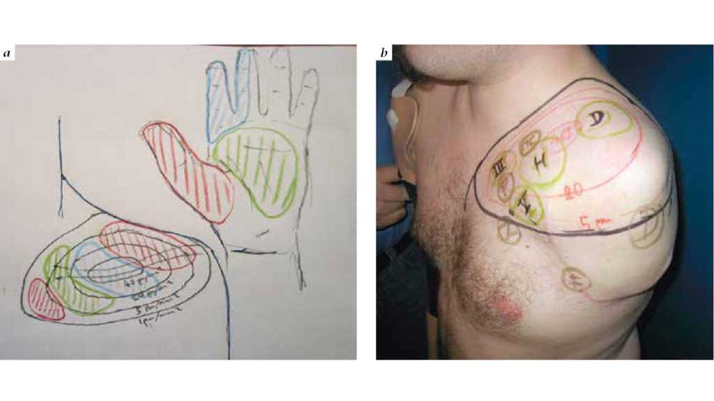 Je nach Amputationshöhe sind verschiedene Nerventransfers möglich, die die neurobiologische Kontaktfläche mit der Prothese erweitern. Selbst auf transhumeraler Ebene sind durch komplexe neuromuskuläre Umordnung vier bis sechs Signalbereiche realisierbar. Das Entscheidende ist eine detaillierte Kenntnis der Anatomie und der spezifischen intraneuralen Topographie, sodass verschiedene Funktionsebenen auch auf limitiertem Raum etabliert werden können und somit eine Steuerung mit größtmöglicher Intuition und Harmonie möglich ist. Selbst in Situationen, in denen ungenügende Zielmuskulatur vorhanden ist, können durch freie funktionelle Muskeltransfers neue Myosignale etabliert werden (Abb. 3a u. b).