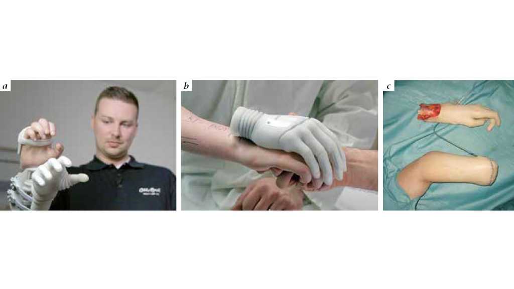 Ein weiteres spannendes Betätigungsfeld der „bionischen Rekonstruktion“ ist die funktionslose obere Extremität. Diese kommt bei Patienten vor, die entweder durch eine Nervenschädigung oder durch einen kritischen Verlust funktioneller Gewebe einen irreversiblen Funktionsverlust der Hand erlitten haben. Auch hier können oben genannte Techniken das biotechnologische Interface so verbessern, dass eine hervorragende bionische Handfunktion erreicht werden kann. Bei manchen Patienten sind selektive Nerventransfers, bei anderen freie funktionelle Muskeltransfers und Veränderungen der skeletalen Strukturen notwendig, um ein bestmögliches Resultat zu erreichen (Abb. 4a – c). Auf diese Weise können selbst Patienten, die schon vor langer Zeit einen solchen Schaden erlitten haben, eine sinnvolle Handfunktion wiedererlangen (Abb. 5a – c).