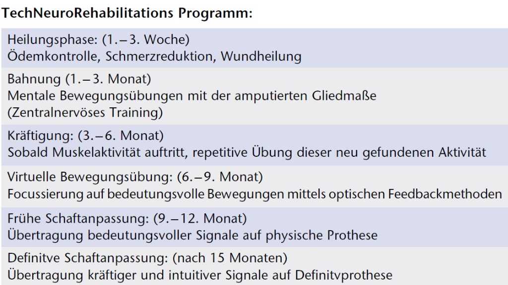 Für ein optimales Endergebnis ist ein mehrstufiges TechNeuroRehabilitationsprogramm notwendig (Tab. 1). Sechs Wochen nach der Operation beginnt eine spezielle Physiotherapie. Zu den Zielen dieser Therapie zählen die Förderung der allgemeinen Fitness und Ausdauer, die Schulung der Bewegungsökonomie sowie ein Rumpf- und Gangtraining.