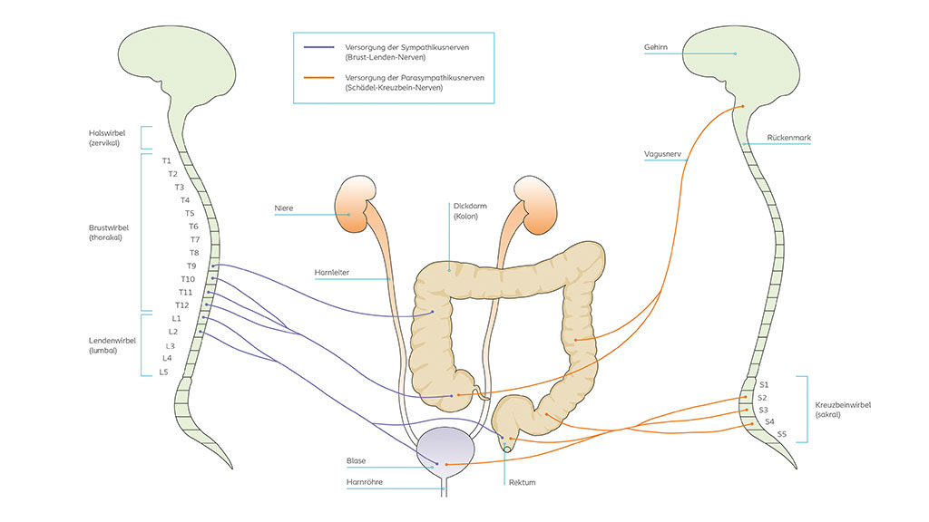 Werden Nervenbahnen verletzt, so können dadurch zahlreiche Funktionsstörungen im menschlichen Körper ausgelöst werden. Zu den häufigsten gehören Blasen- und Darmfunktionsstörungen, die Patienten oft stark belasten und ihre Lebensqualität gravierend einschränken. Dazu kommt, dass einige Formen von Blasenfunktionsstörungen bei Rückenmarkverletzten sogar lebensbedrohlich werden können. Die Art der Funktionsstörung hängt von der Lokalisation der Rückenmarkverletzung ab 2.
