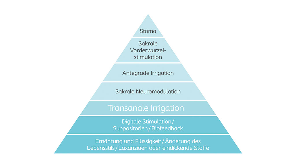 „Darmmanagement bezeichnet die Gesamtheit aller Aktivitäten, die dazu dienen, eine regelmäßige, planbare sowie zeitlich begrenzte Darmentleerung mit ausreichender Stuhlmenge sowie adäquater Stuhlkonsistenz zu erreichen, Gesundheit und Wohlbefinden zu erhalten und Komplikationen sowie ungeplante Stuhlentleerungen zu vermeiden“. Ein wichtiges Ziel des Darmmanagements ist es, Betroffenen eine selbstbestimmte und sichere Darmentleerung zu ermöglichen 17. Das Darmmanagement verhindert Stuhlinkontinenz, Obstipation und lange Toilettenzeiten. Einen Überblick über mögliche Eskalationsstufen des Darmmanagements bietet die Therapiepyramide in Abbildung 2. Deren Stufen werden in den folgenden Abschnitten genauer erläutert.