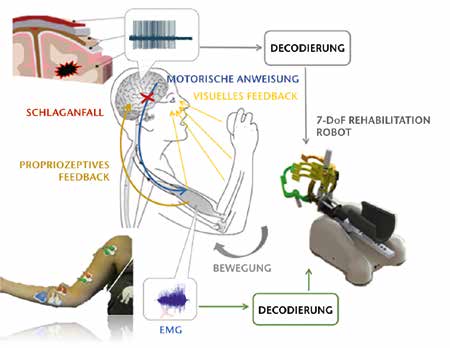 Die Mehrzahl der existierenden neuronalen Interfaces wird ausschließlich dazu verwendet, die Kinematik (Ort und Geschwindigkeit), nicht aber die Kinetik (Kraft und Beschleunigung) der beeinträchtigten Gliedmaße zu steuern. Durch eine kontingente Verknüpfung der ipsiläsionalen kortikalen Areale mit Bewegungen der gelähmten Hand nach dem Schlaganfall (rekurrentes, afferentes Feedback) kann eine funktionale Reorganisation ausgelöst werden. Wird in diesem Kreislauf aber ausschließlich die Hirnaktivität verwendet, gibt es keinerlei Einbeziehung der Muskeln. Dieser Umstand kann potenziell die funktionale Reorganisation des an den visuell-motorischen Aufgaben beteiligten neuronalen Netzwerks beeinträchtigen und so die BMI-Steuerung zur einfachen Unterstützungstechnologie degradieren, die den Patienten auf seinen vorherigen Behinderungsgrad zurückfallen lässt, sobald sie abgeschaltet oder entfernt wird.