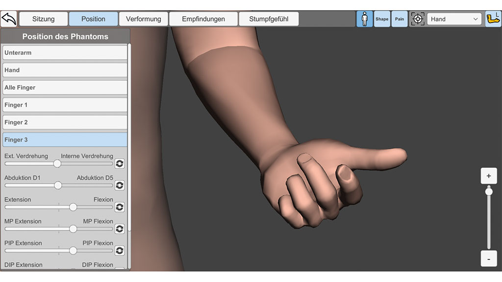 Das Gefühl, dass die Phan­tom­glied­ma­ße in einer oder meh­re­ren ver­dreh­ten oder unna­tür­li­chen Posi­tio­nen fixiert sind, kann abge­bil­det wer­den, indem die ent­spre­chen­den Gelen­ke des 3D-Ava­tars in die von den Pati­en­ten ange­ge­be­ne Posi­ti­on bewegt wer­den. Es kön­nen die Schulter‑, Ell­bo­gen- und Hand­ge­len­ke sowie die ein­zel­nen Fin­ger­ge­len­ke des 3D-Ava­tars ein­ge­stellt wer­den wie auch die Gelen­ke der unte­ren Extre­mi­tä­ten. Alle Gelen­ke kön­nen ent­lang ihrer natür­li­chen Ach­sen und auch um sich selbst unein­ge­schränkt gedreht wer­den. Dadurch kön­nen alle denk­ba­ren und ana­to­misch unmög­li­chen Posi­tio­nen der obe­ren und unte­ren Extre­mi­tä­ten dar­ge­stellt wer­den (sie­he Abb. 1).