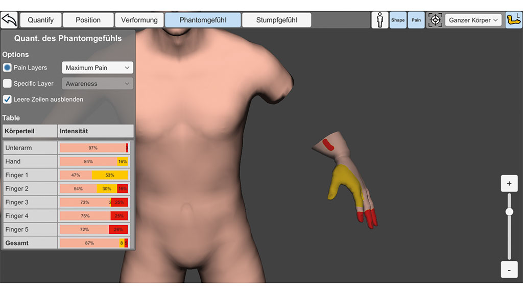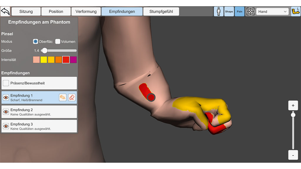 Schmer­zen und Phan­tom­emp­fin­dun­gen kön­nen in C.A.L.A. direkt auf dem 3D-Ava­tar ein­ge­zeich­net wer­den. Dazu wird der Maus­zei­ger oder Fin­ger als Pin­sel ver­wen­det und die Schmer­zen wer­den auf­ge­malt. Die Inten­si­tät der Emp­fin­dung wird anhand der Nume­ri­cal Rating Sca­le (NRS) abge­bil­det. Die Wer­te zwi­schen 0 und 10 sind auf dem Ava­tar durch einen Farb­ver­lauf von gelb (leicht) bis dun­kel­rot (sehr stark) dar­ge­stellt (sie­he Abb. 2). Zusätz­lich kön­nen der Emp­fin­dung meh­re­re Qua­li­tä­ten zuge­ord­net wer­den, die teil­wei­se aus dem Kurz­form-McGill-Schmerz­fra­ge­bo­gen über­nom­men wur­den und teil­wei­se auch selbst defi­niert wur­den wie z. B.: ober­fläch­lich, mit­tel, tief oder bei Ruhe, nachts. Schmer­zen kön­nen sowohl am Phan­tom als auch am Stumpf auf­ge­zeich­net wer­den. Bei Pati­en­ten, die berich­ten, dass sie Tei­le des Phan­tom­glie­des nur ver­rin­gert oder nicht wahr­neh­men, kann die­se emp­fun­de­ne Prä­senz eben­falls direkt auf das Phan­tom gezeich­net wer­den. Tei­le des Phan­toms kön­nen damit auch visu­ell aus­ge­blen­det wer­den (sie­he Abb. 3).