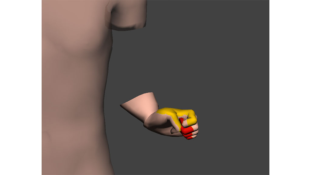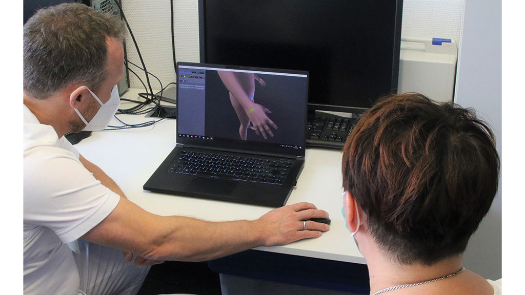 Der Pati­ent zeich­net im engen Aus­tausch mit dem The­ra­peu­ten (Phy­sio-/Er­go­the­ra­peut) den Schmerz auf den 3D-Ava­tar ein (sie­he Abb. 5). Die poten­zi­ell ver­än­dert emp­fun­de­ne Posi­ti­on bzw. Gestalt der Phan­tom­ex­tre­mi­tät wird eben­falls gemein­sam model­liert, sodass sowohl der Pati­ent als auch der The­ra­peut eine sehr dif­fe­ren­zier­te und plas­ti­sche Vor­stel­lung von der aktu­el­len Phan­tom­wahr­neh­mung bekommen.