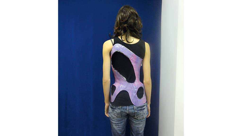Betrachtet man ein Korsett unter diesen Wunschaspekten, treten die Störfaktoren der Compliance deutlich hervor: Kanten, Polster, Schiene oder auftragende Korsettformen (thorakaler Ausweichraum) – dies sind die typischen Begleitelemente einer Korsettversorgung aus PE oder PP. Nur selten kann man das Material so weit reduzieren, um einen optisch ansprechenden Effekt zu erhalten, ohne dass wichtige Elemente der Korrektur darunter leiden.