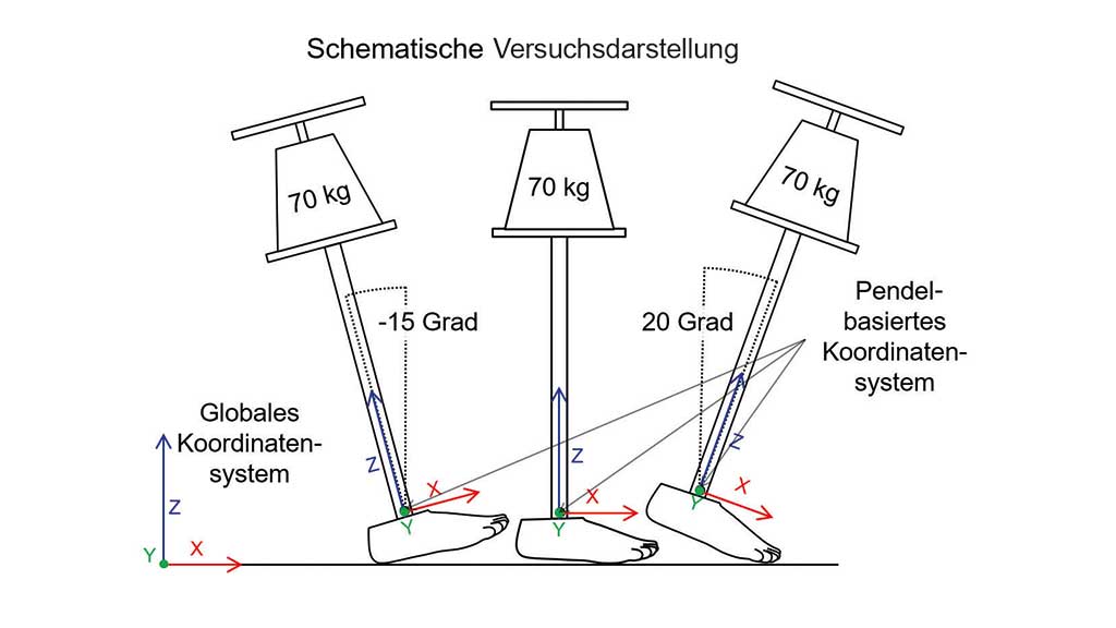 In der Studie „gedruckter Prothesenfuß“, die an der Klinik für Orthopädie des Universitätsklinikums Heidelberg in Kooperation mit der Firma Mecuris (München) durchgeführt wurde, wurden die untersuchten Prothesenfüße mit einem Prüfstand in Anlehnung an Curtze et al. getestet (Abb. 1)12 13. Bei diesem Aufbau wurde eine Konstruktion in Form eines umgekehrten Pendels mit einer proximalen Masse (70 kg, ca. 1 m Höhe) verwendet, an dem die Prothesenfüße distal befestigt waren. Das Pendel wurde während des Versuchs von zwei Personen bewegt, um eine physiologische Belastung des Prothesenfußes in der einbeinigen Unterstützungsphase zu simulieren (Abb. 2). Dabei wurde das Pendel gegenüber der vertikalen Raumachse kontinuierlich von einer 15-Grad-Rückneigung bis zu einer 20-Grad-Vorneigung bewegt (Abb. 2).