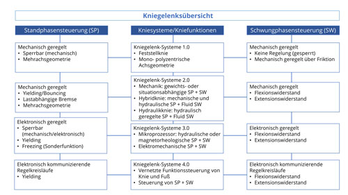 Eine Vielzahl von Prothesenkniegelenken ist am Markt erhältlich. Betrachtet man die Hauptzielgruppe der Anwender mit transfemoraler Amputation, hilft das Schaubild aus dem „Qualitätsstandard Prothetik der unteren Extremität“1, um die Kniegelenke nach Funktionalitäten und unabhängig vom Hersteller zu unterscheiden (Abb. 1). Dabei werden vier verschiedene Typen von Kniegelenken differenziert: