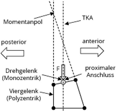 Nachteil einer Polyzentrik ist das unmögliche bzw. blockierte alternierende Gehen auf einer schiefen Ebene oder Treppe („yielding“ = kontrolliertes Einsinken gegen einen Widerstand), da durch die Lage des Momentanpols einer Polyzentrik die mechanische Sperre der Kinematik wirkt. Dabei stellt der Momentanpol den momentanen Drehpunkt des proximalen Anschlusses dar (Abb. 3). Der Abstand zwischen Momentanpol und Krafteinleitung bedingt das eingeleitete Drehmoment (Flexions- und Extensionsmoment). Außerdem sind polyzentrische Kniegelenke in der Regel nicht mikroprozessorgesteuert, sodass die eingestellte Flexions- und Extensionsdämpfung nur für eine bestimmte Gehgeschwindigkeit optimiert ist. Folglich sind die Hersteller in der Regel auf eine leichter zu steuernde Monozentrik ausgerichtet.