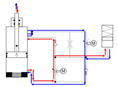 Die Funktionsweisen können anhand des Hydraulikschaltplans nachvollzogen werden (Abb. 4). Neben den beschriebenen Funktionsweisen erlaubt der Hydraulikzylinder eine Sperrung des Kolbens und somit der jeweiligen Kinematik.