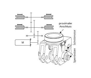 Die Integration einer elektromechanischen Schalteinheit in einem eng bemessenen Bauraum unter den Randbedingungen des Leichtbaus und der hohen wirkenden Kräfte ist als herausfordernd anzusehen. Im „VarioKnie“ ist die Schalteinheit im proximalen Anschluss (54 × 60 × 64 mm) integriert und als Elektromotor-Getriebe-Einheit konzipiert (Abb. 5), die synchron vier Sperrbolzen aktuiert und somit entweder die Monozentrik oder die Polyzentrik freigibt. Das erzeugte Drehmoment des Schrittmotors wird dabei über mehrere Zahnradstufen erhöht und durch den jeweiligen Spindelantrieb des Sperrbolzens in eine axiale Bewegung umgewandelt.