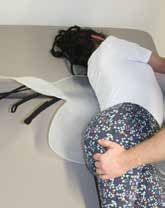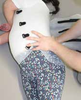 Nun kann die 2. Anprobe erfolgen. Dabei ist es wichtig, neben der Passform des Korsetts auch gleich die vorhandenen Hilfsmittel zu testen und diese nach Bedarf neu anzupassen oder umzubauen. Bei Sitzschalen ist meist ein neuer Vakuumabdruck notwendig, da sich die komplette Statik durch die Korrektur verändert. Auch wird bei einer adäquaten Korsettkorrektur der Patient um bis zu 6 cm „wachsen“. Bevor das Korsett nach ca. 30 Minuten entfernt und der Patient auf mögliche Druckstellen untersucht wird, werden die beiden Lochöffnungen der Spange auf das Inlett übertragen. Zur Fertigstellung werden am Inlett je nach Größe 3 bis 5 rücklaufende Klettverschlüsse angenäht; an den angezeichneten Löchern werden zwei Streifyflexpunkte mit 18 mm Durchmesser aufgeschweißt. Diese dienen beim Anziehen als Orientierung, wo die Spange am Inlett sitzen muss. Die Spange wird in der Regel mit 2 rücklaufenden Klettverschlüssen verschlossen. Wichtig ist, dass kein Gurt direkt über die PEG-Öffnung geführt wird und der unterste Gurt nicht das Sitzen beeinträchtigt.