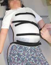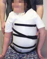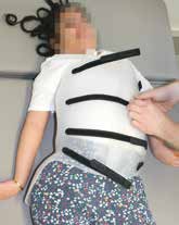 Das sogenannte Nemus-Korsett (abgeleitet aus „Neuromuskuläre Skoliose“) erfüllt all diese Anforderungen, da es aus einem flexiblen Inlett und einer Gießharzspange besteht (Abb. 1). Das durchsichtige Inlett hat den Vorteil, dass später beim Anziehen Falten im Unterziehshirt besser zu erkennen und zu entfernen sind.