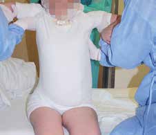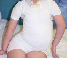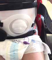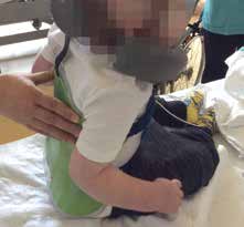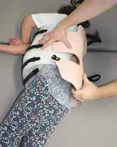 Bei den meisten Patienten kommt es durch das Tragen des Korsetts zu einer deutlichen Verbesserung der Kopf- und Armkontrolle. Wenn die Kopfkontrolle nicht ausreicht (Abb. 4), werden mit einem 3D-Scan Kinn- oder Kopfstützenabdrücke erstellt. Die Stützen werden über ein gefrästes Hartschaummodell tiefgezogen oder direkt in Schaum gefräst. Die Befestigung der Kinnstütze erfolgt mit Klettverschluss direkt am Korsett, damit sie zum Essen oder zur Logopädie entfernt oder anders positioniert werden kann. Die Kopfstütze wird über einen Führungskanal mit einem Carbonstab direkt an der Spange eingesetzt (Abb. 5).
