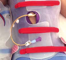 Wenn ein ständiger Zugang zum PEG nötig ist, muss eine Öffnung geschaffen werden. Dabei ist es wichtig, in die Zunge und die Überlappung zwei U‑förmige Öffnungen zu schneiden (Abb. 6). Es sollte kein Loch ins Inlett geschnitten werden, da bei unsachgemäßem Umgang beim Ausziehen der PEG herausgerissen werden könnte. Eventuell müssen Gurte ähnlich einem Stomaring umgeleitet werden, damit sich das Inlett beim Sitzen nicht aufspreizt (Abb. 7).