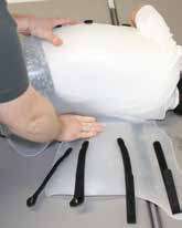 Über das vorhandene Gipsmodell wird nun das Streifyflex gearbeitet, sodass es frontal um ca. 10 cm überlappt. Für kleinere Korsette wird 4 mm Materialstärke verwendet, die bei Bedarf auch noch etwas ausgezogen werden kann. Größere Korsette werden mit 5 mm Streifyflex gefertigt. Für die erste Anprobe wird das Inlett vom Modell abgenommen und so zugeschnitten, dass eine Hüftbeugung von mindestens 90° möglich ist. Unter den Armen sollte maximal ein Finger Platz sein. Die PEG-Öffnung wird angezeichnet und bei Bedarf ausgeschnitten. Nach der Anprobe wird auf dem Modell das Inlett durch einen Microkork-Dummy ersetzt, über den ein PVA-Folienschlauch gezogen und abgesaugt wird.
