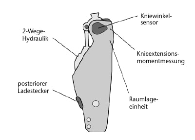 Das neue C‑Leg bleibt weiterhin ein mikroprozessorgesteuertes, einachsiges Kniegelenksystem. Es verwendet eine Hydraulik mit dem bereits bekannten 2‑Wege-Prinzip, bei der die Widerstände in Flexions- und Extensionsrichtung unabhängig voneinander durch den Mikroprozessor stufenlos verstellt werden können 7. Die Abtastfrequenz wurde auf 100 Hz erhöht. Ein großer technologischer Fortschritt ist die Einführung einer neuartigen 6‑achsigen IMU (Inertial Motion Unit), die mit einem eigenen Mikroprozessor die Lage des Kniegelenks im Raum berechnet. So stehen dem Steueralgorithmus Informationen über den Raumwinkel, die Rotation im Raum und die Beschleunigung des Knies in allen 3 Koordinatenachsen zur Verfügung. Die Einführung dieser Technologie ermöglichte den Verzicht auf den – beim Vorgängermodell nicht immer beliebten – elektronischen Rohradapter. Zur Kraftmessung wird nun das Knieextensionsmoment erfasst (Abb. 2), welches zusammen mit der IMU und einem Kniewinkelsensor zuverlässig Informationen über den Bewegungs- und Belastungszustand der Prothese gibt.