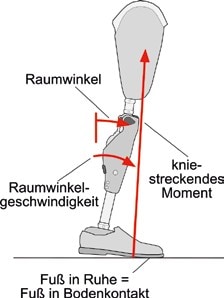 Die Aufgabe der Schwungphasenauslösung ist das Erkennen der terminalen Standphase, da hier der Beugewiderstand in Vorbereitung für die Einleitung der Schwungphase niedrig gestellt werden soll. In der späten Standphase kann das unbemerkt und sicher geschehen, weil das Kniegelenk durch den am Fuß vorgerückten Kraftvektor in den Extensionsanschlag gedrückt wird und so nicht unkontrolliert einknicken kann. Während Ottobock in den 90er Jahren mit der Messung des Knöchelmomentes die damals technologisch fortschrittlichste Erkennung dieses Zeitpunktes verwendete, ist es heute möglich, durch die IMU und einen patentierten Algorithmus die terminale Standphase direkter zu bestimmen. Schlussendlich ist die terminale Standphase durch eine Vorwärtsneigung und Vorwärtsrotation des Beins unter Belastung definiert 8. Die IMU ermittelt dabei direkt die Information, die bei den Vorgängermodellen noch durch die Knöchelmomentenmessung (damals bestmöglich) geschätzt wurde 9. Neben der Vorwärtsneigung und der Vorwärtsrotation sind der Bodenkontakt des Fußes (Fuß in Ruhe) und ein streckendes Moment im Knie Kriterien für die Einleitung der Schwungphase (Abb. 3). Der neue Algorithmus ist dadurch gewichtsunabhängiger, erlaubt kleinere Schritte und den besseren Übergang in die Schwungphase auf weichem sowie unebenem Untergrund. Die ersten Schritte mit dem neuen C‑Leg sind somit leichter zu erlernen. Auch sicheres Rückwärtsgehen ist möglich, da die Schwungphase beim Rückwärtsgehen nicht mehr ausgelöst werden kann.