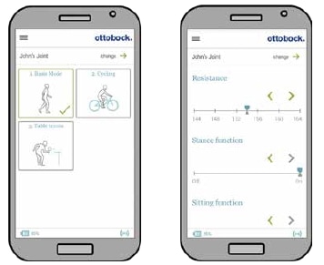 Um das Mensch-Maschine-Interface zu verbessern, wurde eine Bluetooth®-Schnittstelle in das Gelenk integriert. Dadurch wurde es möglich, eine Android-App zum Wechseln der Modi, zum Feinjustieren von Einstellwerten und zum Abrufen von Informationen der Prothese anzubieten, die das moderne, intuitive Userinterface von Smartphones nutzt (Abb. 5). Die App läuft auf allen gängigen Android-Smartphones. Besondere Anforderungen von Apple an die Bluetooth®-Hardware erlauben es leider momentan technologisch nicht, eine iOS-App anzubieten. Alternativ kann die Ottobock Remote Control 4X350 verwendet werden. Die Bluetooth®-Schnittstelle lässt sich deaktivieren, beispielsweise während einer Flugreise. Die maximale Lautstärke des Beepers (akustischer Signalgeber) wurde erhöht; das akustische Signal lässt sich nun in Lautstärke und Tonhöhe einstellen.