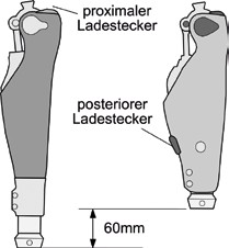 Das neue C‑Leg ist mit 289 mm distaler Systemhöhe 60 mm kürzer als das Vorgängermodell, was es erleichtert, Anwender mit orthopädietechnisch herausfordernden Gegebenheiten zu versorgen und funktionellere, höher bauende Füße zu verwenden (Abb. 4). Es ist für 136 kg Körpergewicht freigegeben. Zum Schutz gegen Feuchtigkeit wurde es wetterfest gemacht. Spritzwasser, Regen oder ein kurzer Süßwasserschwall schaden dem Gelenk nicht. Längeres Untertauchen und korrosive Medien wie zum Beispiel Salz- oder Chlorwasser bleiben aber dem Genium X3 vorbehalten. Die Position des Ladesteckers wurde an den posterioren Unterschenkel verlegt, um das Eindringen von Wasser zu verhindern und eine bessere kosmetische Versorgung im Kniebereich zu ermöglichen. Der Beugewinkel wurde auf 130° erhöht. Um das Gelenk vor Beschädigungen durch den Schaft zu schützen, gibt es die Möglichkeit, den maximalen Beugewinkel durch Anschlagselemente um 8° zu verringern.
