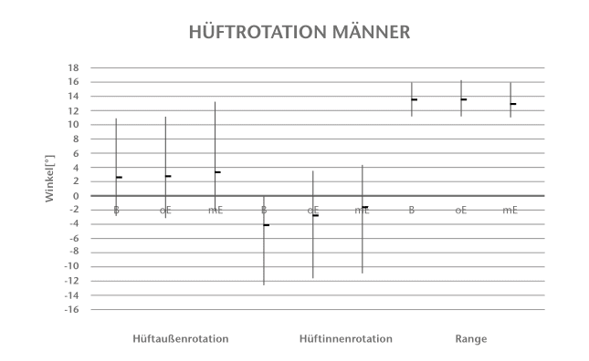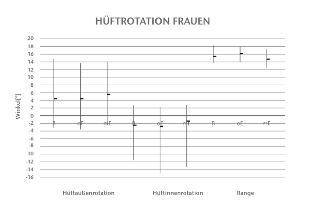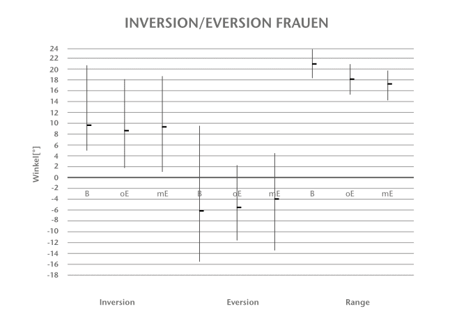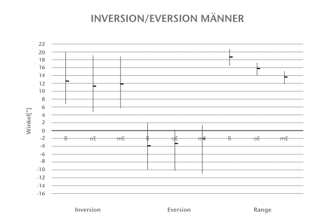 Die Diagramme in den Abbildungen 3 bis 8 zeigen die Auswertung der Winkel- und Belastungsmessungen. Dargestellt sind jeweils die errechneten Mittelwerte sowie der Maximal- und Minimalwert eines Probanden für die Barfußmessung (= B), die Messung ohne Einlage (= oE) und die Messung mit Einlage (= mE). Die große Streuung resultiert aus der von jedem Probanden unterschiedlich gewählten Geschwindigkeit. Der Begriff „Range“ bezeichnet im Folgenden den Bewegungsumfang beziehungsweise die Differenz der Außenrotations- und Innenrotationsmomente.