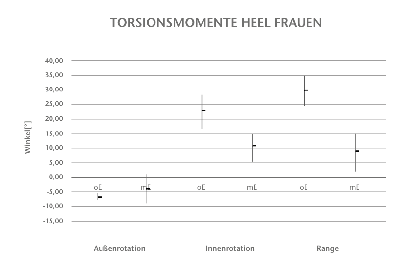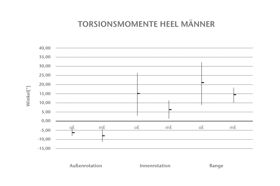 Die Vergleiche der Torsionsmomentmessungen an der Messstelle Heel (Abb. 7 u. 8) weisen nur bei Innenrotationsmoment und Range eine statistische Signifikanz bei Messungen mit Einlage auf. Das Innenrotationsmoment verringert sich bei den männlichen Probanden durch die Einlage im Mittel von 15,00 Nmm auf 5,56 Nmm (pm = 0,031). Die Range zwischen Außenrotations- und Innenrotationsmoment verkleinert sich um 6,6 Nmm (pm = 0,047).