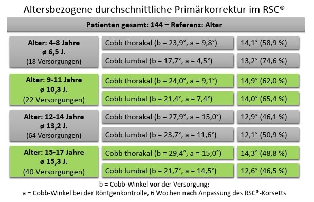 In allen Fällen erfolgte die Formerfassung mittels 3D-Scan; eine Woche nach der Korsettabgabe erfolgte die erste Nachkontrolle, weitere zwei Wochen später eine weitere Folgekontrolle. Sechs Wochen nach der Korsettabgabe erfolgte das Kontrollröntgen. Die Patienten waren zwischen 4 und 17 Jahre alt und wurden in unterschiedliche Kontrollgruppen eingeteilt, abhängig von Alter und Krümmungsmuster nach Rigo (Abb. 5). Der durchschnittliche Cobb-Winkel betrug thorakal 27,4° (+/- 46°), lumbal 23,8° (+/- 37°). Im Folgenden wird auf die Ergebnisse bezüglich der Aspekte Primärkorrektur, Derotation, Tragezeit und Compliance eingegangen.