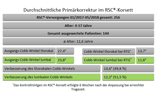 Gemeinsam mit der Abteilung für Kinderorthopädie und Fußchirurgie des Orthopädischen Spitals Speising in Wien sowie drei hochspezialisierten niedergelassenen Fachärzten für Orthopädie hat das Team der Orthomanufaktur Grasl den Versorgungsverlauf von bislang 144 Patienten ausgewertet, um diese Frage zumindest teilweise beantworten zu können. Dabei hat sich gezeigt, dass vermutlich kein kausaler Zusammenhang zwischen Tragezeit und Verbesserung des Cobb’schen Winkels (jedoch ein direkter Zusammenhang zwischen Tragezeit und Rotationsverbesserung ohne Korsett) besteht. Alle Patienten wurden mit einem RSC®-Korsett der Firma Ortholutions versorgt; Klassifikation und Modellauswahl erfolgten nach Rigo 5; alle RSC®-Braces (Abb. 4) wurden mit einem Orthotimer® ausgestattet.