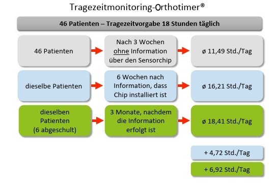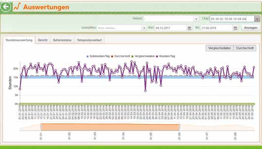 Jeder Chip wird dabei codiert einem Patienten zugewiesen und kann, um den Datenschutz zu gewährleisten, nur von jenem Lizenzinhaber ausgelesen werden, der den Orthotimer® aktiviert hat. Über die Software können die vorgegebene Tragezeit sowie unterschiedliche Spezialanforderungen, z. B „24 Stunden am Stück zu tragen“ individuell definiert werden. Das Ausleseergebnis wird als übersichtliche Grafik angezeigt und kann als PDF-Datei gespeichert und weitergeleitet werden (Abb. 2).