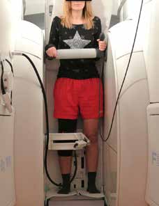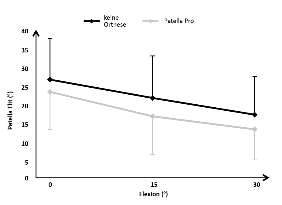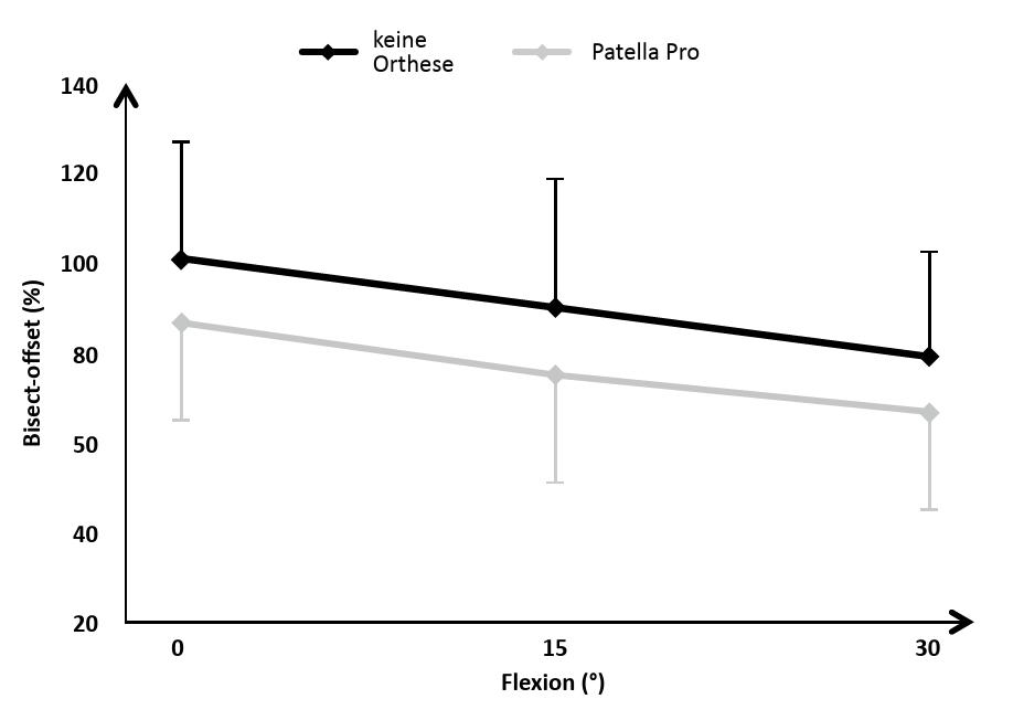 Rezentrierungsorthesen können durch die nach medial auf die Patella wirkende Kraft auch einen direkten biomechanischen Effekt erzielen. So konnte im Rahmen einer Fall-Kontroll-Studie die biomechanische dynamische Wirksamkeit der patellastabilisierenden Orthese „Patella Pro“ (Otto Bock GmbH, Duderstadt; Abb. 1) bei 20 Patienten mit lateraler Patellainstabilität mittels Kernspintomographie (MRT) unter Belastung nachgewiesen werden (Abb. 2). Dabei wurden erkrankungstypische patellofemorale MRT-Parameter im Stehen mit und ohne Orthese bei durchgestrecktem Knie sowie bei kontrollierter Flexion von 15° und 30° untersucht (Abb. 3). Mit angelegter Orthese zeigte sich eine signifikante Verminderung des Patella-Tilt (Abb. 4) und des Bisect-Offset (Maß für die Lateralisierung der Patella; Abb. 5). Der Patella-Tilt verminderte sich um 3.2° ± 2.8° in voller Streckung, um 5.0° ± 3.6° bei 15° Flexion und um 4.0° ± 4.3° bei 30° Flexion. Der Bisect-Offset und damit das Ausmaß der Lateralisierung verminderte sich um 14.2 ± 10.9 % in voller Streckung, um 15.6 ± 12.6 % bei 15° Flexion und um 12.3 ± 11.8 % bei 30° Flexion. Auch die Patellahöhe und der TTTG-Abstand (bei 15° und 30°) waren statistisch signifikant positiv beeinflusst 19.