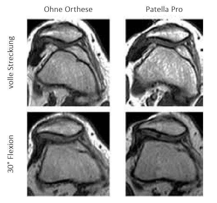 Ein signifikant größerer patellastabilisierender Effekt einer speziell dafür ausgelegten Orthese („QLok“, Cropper Medical Inc., Ashland, USA) wurde auch im Vergleich zu einem normalen Kniestrumpf ohne biomechanische Funktion und zur Situation ohne Orthese oder Strumpf in einem Flexionsbereich von 0 bis 60° im MRT nachgewiesen 20.